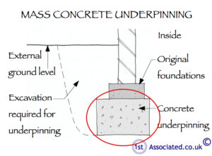 Mass concrete underpinning is an established or traditional technique and is a method of underpinning suitable for relatively shallow depths of underpinning.